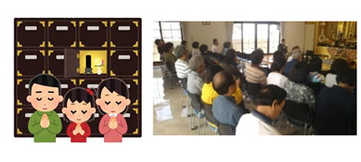 法要の無い毎月第2日曜日午前10時より 内容(お経のお勤め・法話・茶話会) 僧侶が仏様のお話をいたします。 |