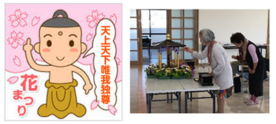 4月8日は、お釈迦さまのお誕生をお祝いする「花まつり」の日です。お釈迦さまは、今から約2500年前、現在のインド国境に近いネパールの地、ルンビニーの花園でお生まれになりました。「花まつり」は、ルンビニー園の誕生の様子を表した「花御堂」を飾り、その中央には天地を指差した誕生のお姿を安置し、甘露の雨を模した甘茶をかけ、華やかにお祝いをいたします。 |